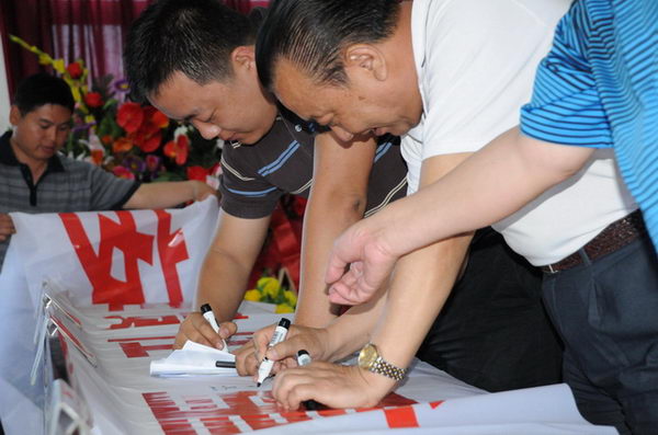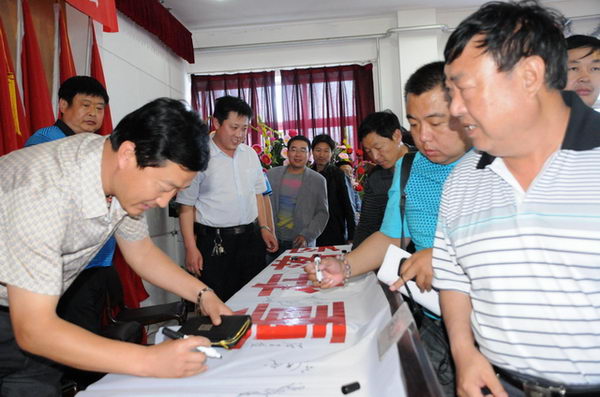 安监站领导与董事长在安全宣传标语上签名 |